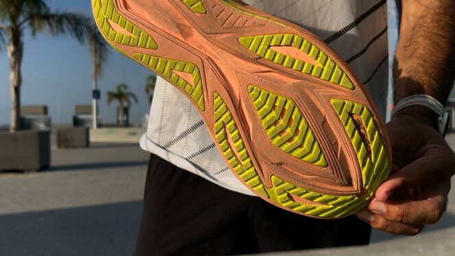 Que sea una zapatilla tan sumamente ancha de base, hace también que sea una zapatilla estable. Los salientes que vemos tanto en el talón como en la parte delantera, permiten que al pisar, aunque llevemos muchos kilómetros encima, nos sintamos más seguros y en gran parte, “guiados” y controlados. Eso lo notarás en kilómetro 1 o en el 40.