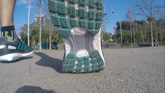 Centrándonos en la suela Adiwear, hemos de comentar que nos ha funcionado muy bien proporcionando gran tracción y control prácticamente en todo tipo de superficies ya sea asfalto, suelo pavimentado y superficies arenosas como caminos de tierra compacta que podemos encontrar en parques o pistas forestales. En mojado, sobre asfalto el comportamiento es muy similar ofreciendo un agarre muy bueno, y creíamos que en suelos pavimentados nos iban a patinar, pero el resultado ha sido muy satisfactorio ya que no ha sido así y ha respondido a la perfección.