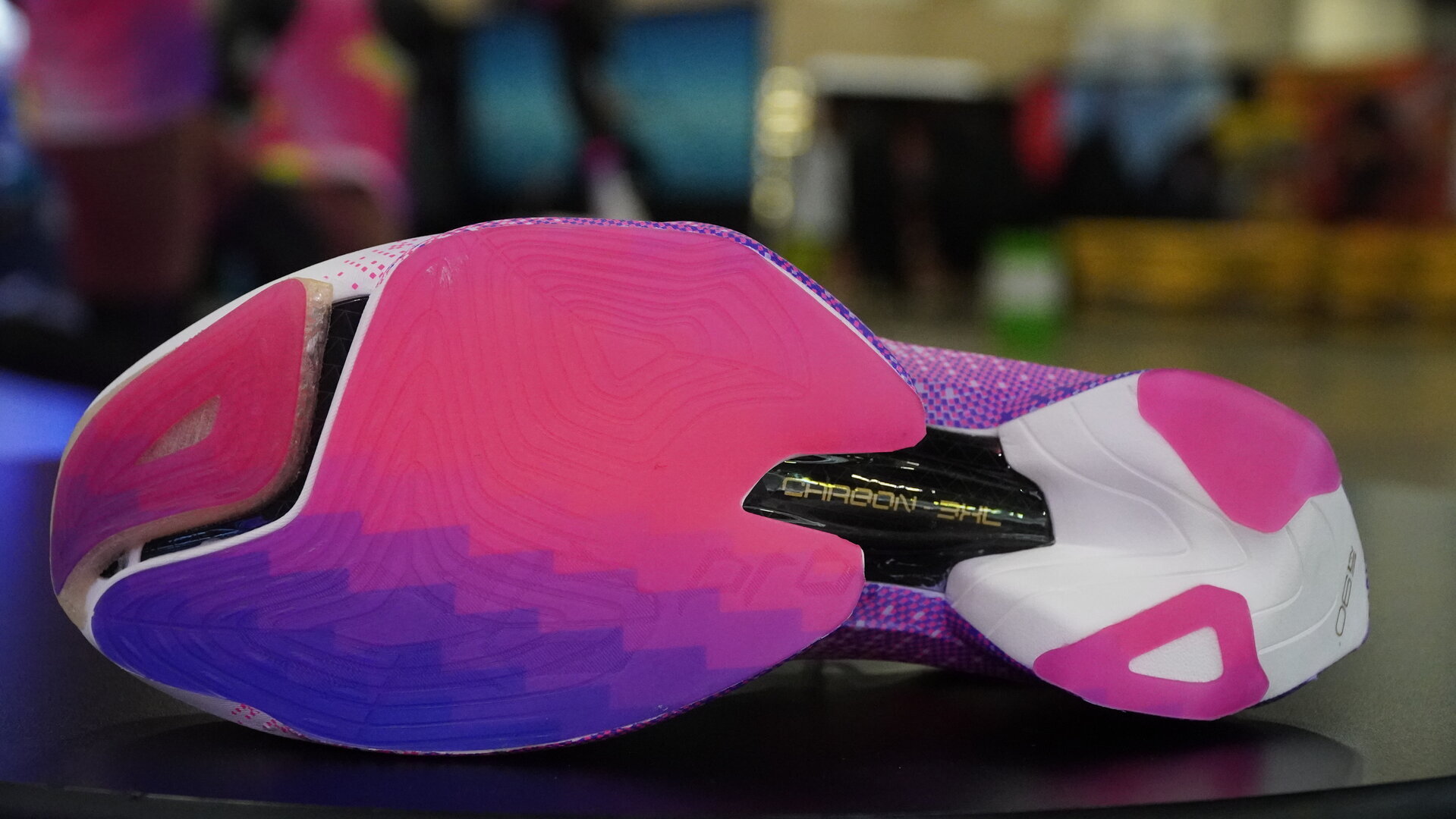 Sus geometrías es lo que más sorprende de ella. Una mediasuela dividida prácticamente en dos partes donde la placa de fibra de carbono, parece unir ambas zonas. Personalmente nos recuerda bastante a lo que Puma trabaja con el diseño de la Fast R Nitro Elite 3 .