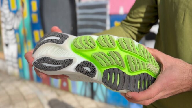 La suela es uno de los puntos más innovadores: muy segmentada, con surcos profundos que permiten una flexión muy marcada en mediopié. El DNA Tuned queda más protegido en el interior y no está expuesto directamente al terreno.