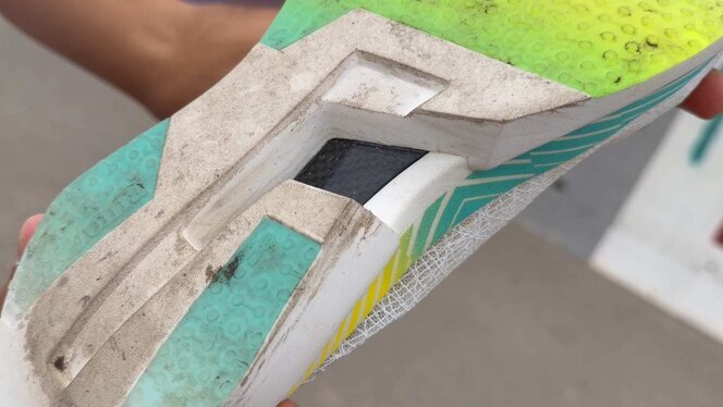 Una suela que cuenta con un detalle que no queríamos dejar de lado. El caucho es translúcido, tiene una especie de microtaco delantero, y además, parece quedar insertado en la mediasuela. Este detalle nos sorprendió porque no lo habíamos visto antes y porque entendemos, Joma ha buscado protegerlo al máximo aumentando así, su durabilidad. Ya os decimos, solamente la hemos utilizado en tres ocasiones, así que hablar de durabilidad, no es del todo realista. Aun así, tenemos que reconocer que este compuesto de mediasuela no parece ser, por lo menos al tacto, demasiado duradero.