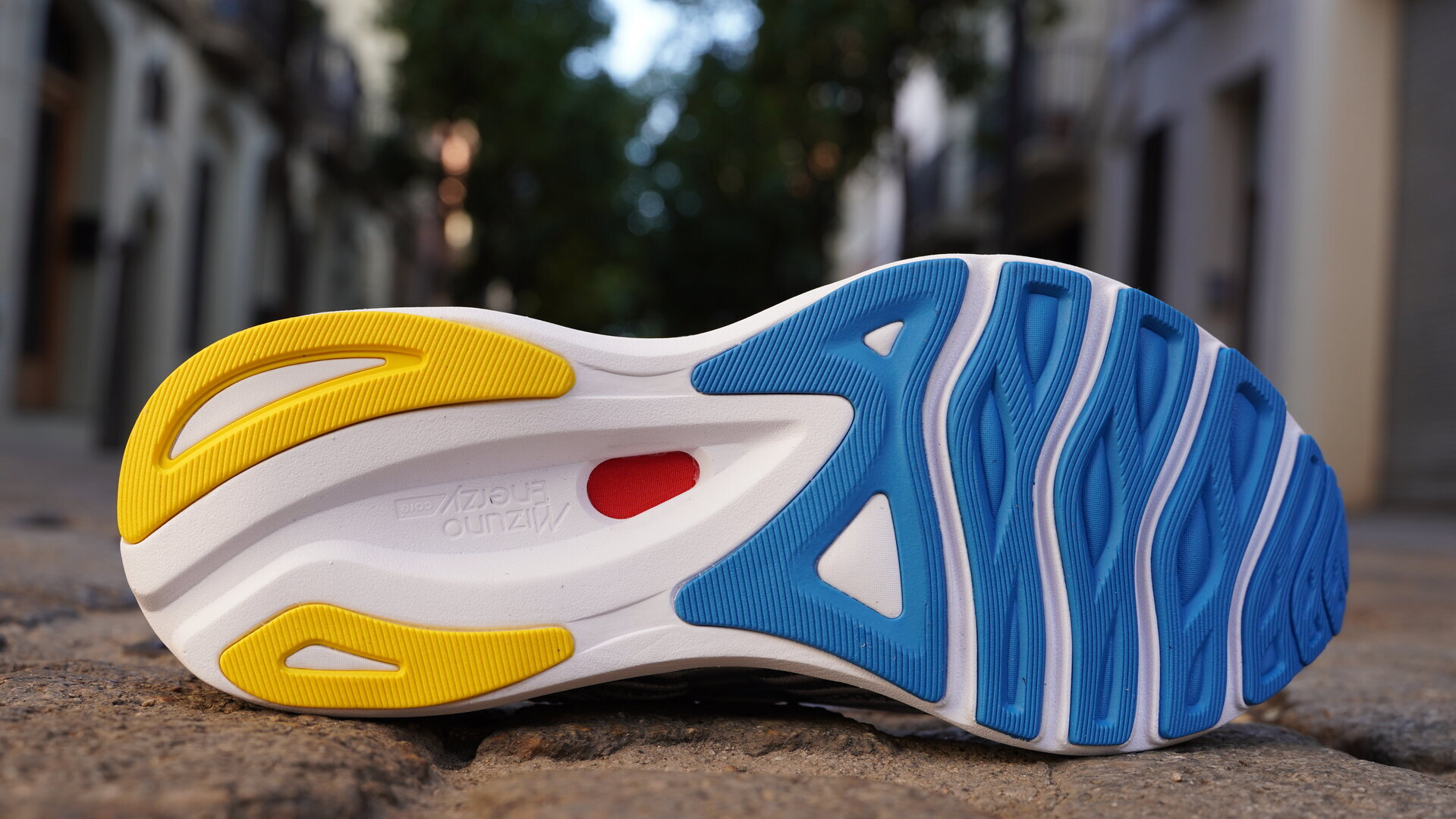 Como observaréis, no hay ningún tipo de placa Wave a lo largo de la mediasuela. La Sky, ya desde hace un par o tres de versiones, utiliza la evolución de la mítica placa de Mizuno. Ahora tenemos un juego de espumas que con un diseño ondulado y el conocido Foam Wave, que entre ambos juegan y se moldean para, durante la transición talón-puntera, ofrecer una transición lo más amigable posible.