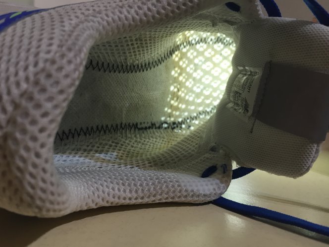 Toda la meseta central de las New Balance Vazee Breathe, se componen tal cual la descripción, y es en los laterales y zona de la puntera donde existe una tercera capa a modo de protección. Entendemos la necesidad de dicho elemento, pues el inofensivo mesh se vería deteriorado al poco tiempo. Esta tercera capa azul, tal como vemos en las fotografías, también continua manteniendo la estructura porosa a lo largo de la zapatilla, rematándose en la parte trasera del talón.