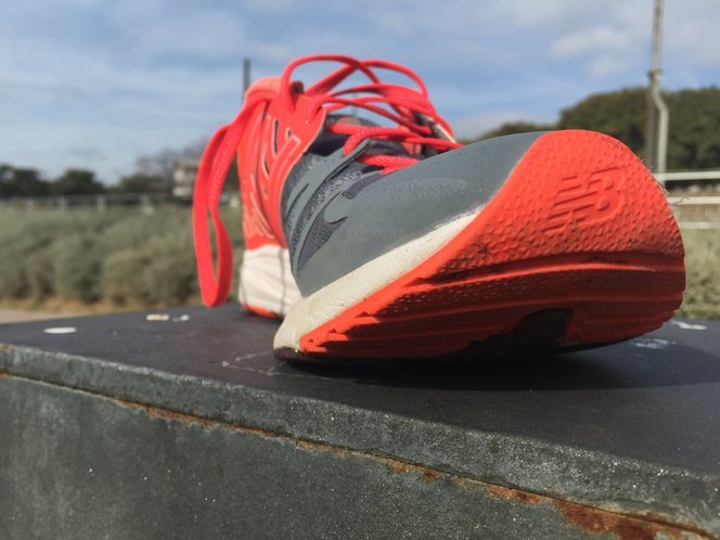 Normalmente, la experiencia nos ha demostrado la utilización de dos tipos de materiales en la suela, pues hay que decir que de nuevo en estas zapatillas, al igual que con la mediasuela, se ha elaborado con uno único. Blown rubber, o caucho soplado es lo situado en las zonas estratégicas de la misma. En nuestras New Balance Vazee Rush diferenciamos dos agrupaciones naranjas en el talón, cuatro marrones en la parte media en forma de romboides y una última en la puntera. Ciertamente responde muy bien al desgaste y a la abrasión del asfalto manteniendo su dibujo e integridad de forma muy digna. Se integra a la perfección ante la espuma REVlite de la mediasuela, dibujando en ésta una forma de letra X a la altura media, que no es más que una forma de proporcionar flexibilidad. Hay un bloque de Blown rubber a la altura del talón, que es el que marca la diferencia a lo largo de la suela, longitudinalmente el más grande, ocupando gran parte de la zona externa y dibujando una forma en L. Toda la suela es de grosor uniforme, dejando libre el arco sin protección alguna, y en general el total de superficie libre sin Blown rubber es bastante predominante. En porcentajes de materiales vistos, el de la suela, livianamente supera al REVlite de la mediasuela. Las zapatillas han dado un gran resultado en cuanto a tracción y adherencia en terrenos varios, diferenciando el tartán, el asfalto y la arena. Hemos encontrado problemas en superficies húmedas como losetas típicas del pavimento de aceras y pasarelas de madera.