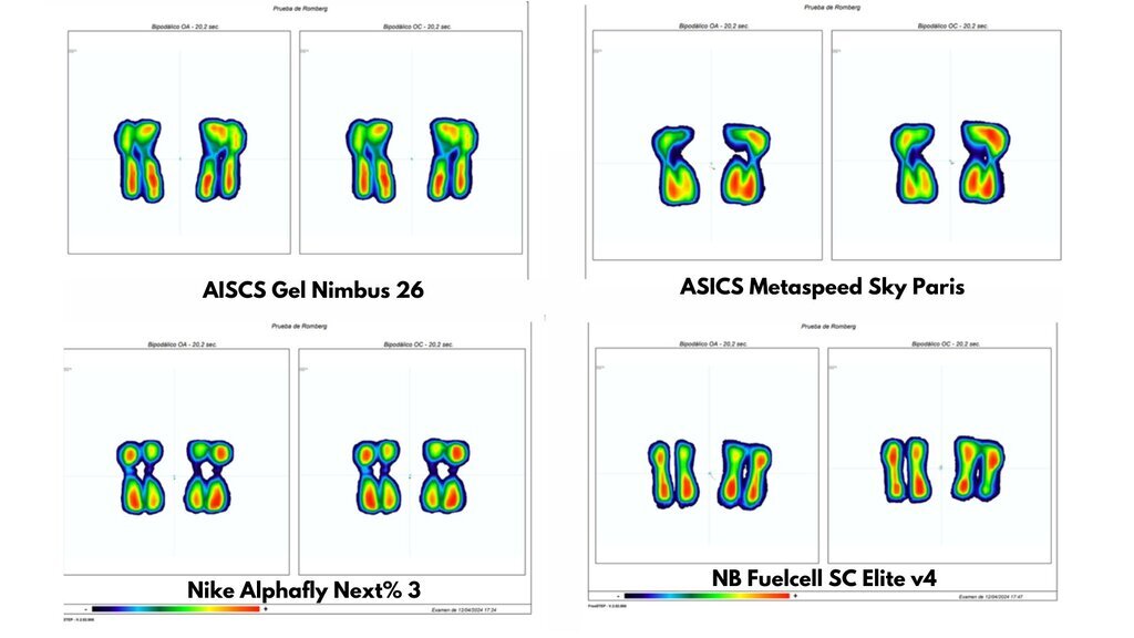 Durante 20 segundos con los ojos abiertos y seguidamente durante otros 20 segundos con los ojos cerrados, el sujeto se dispuso sobre la plataforma para valorar el equilibrio y la afectación de estas 6 zapatillas.