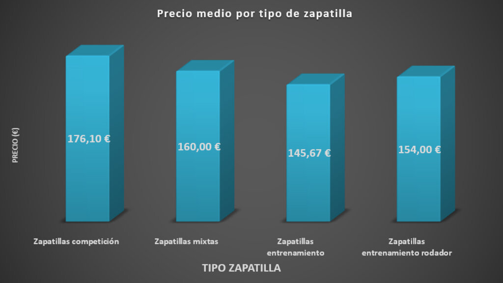 Escoger un tipo de zapatilla u otro puede suponer también un menor o mayor gasto económico. ¿Eres amante de la competición ? Probablemente tendrás que gastarte algo más de dinero (176,10€) si quieres una zapatilla específica para el día D y la hora H.
